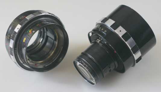 最下段の4個だけがオリジナルのレンズ(多分テレビ用)で、それ以外はニコンFマウントに改造するためのヘリコイドとアダプタ部分です。