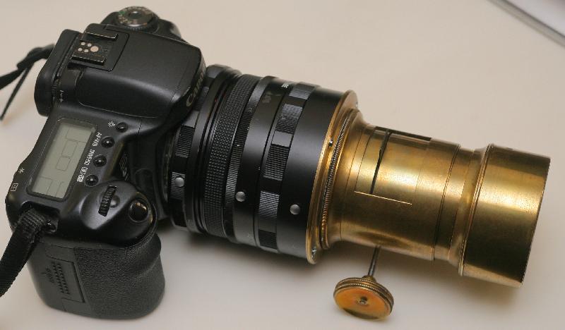 Dallmeyer Petzvalのフランジ金具をPENTAX 67の中間リングに接着し、EOSで使えるよう改造しました。