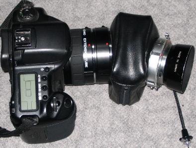 特殊なネジなので、EOSマウントを作りました。ミラーを干渉しない範囲で、ぎりぎりまで撮像素子に近づけるため、蛇腹は使えません。最初レンズキャップを使って左の写真のようなものを作ったのですが、これは失敗。ヘリコイドを回すと、カメラからはずれてしまうのです。レンズキャップはバヨネットのロックがかからないため。また、ゴム系の接着剤を使ったのですが、大変みにくくなってしまいました。作りなおそうと接着剤をはがしにかかったのですが、一苦労。ギザギザの中に入った接着剤は容易には取り除けません。右が作り直したもの。全部銀色でまとめてみました。これでミラーに干渉しないぎりぎりのところ。残念ながら予想通り無限遠は出ませんでした。マクロ専用ですね。