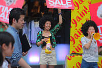 お店は大変です。店の中に入った水を掃きだしたり、雷雨で途切れた客を呼び込んだり。