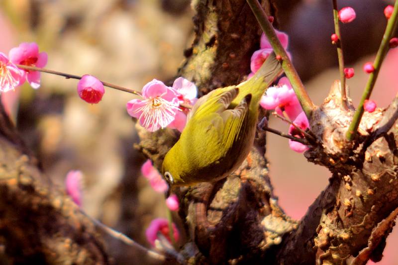 安政四年頃パリのジャマン社で製造されたレンズ。このレンズの焦点距離は約400mmなので、デジカメに取り付けるとメジロの撮影にも適しています。メジロはいっぱいいて、特に人を恐れるわけでもないので比較的簡単に撮影できます。まだ葉が出ていないので、メジロの顔に日光が良く当たるので、撮りやすいです。(Pentax