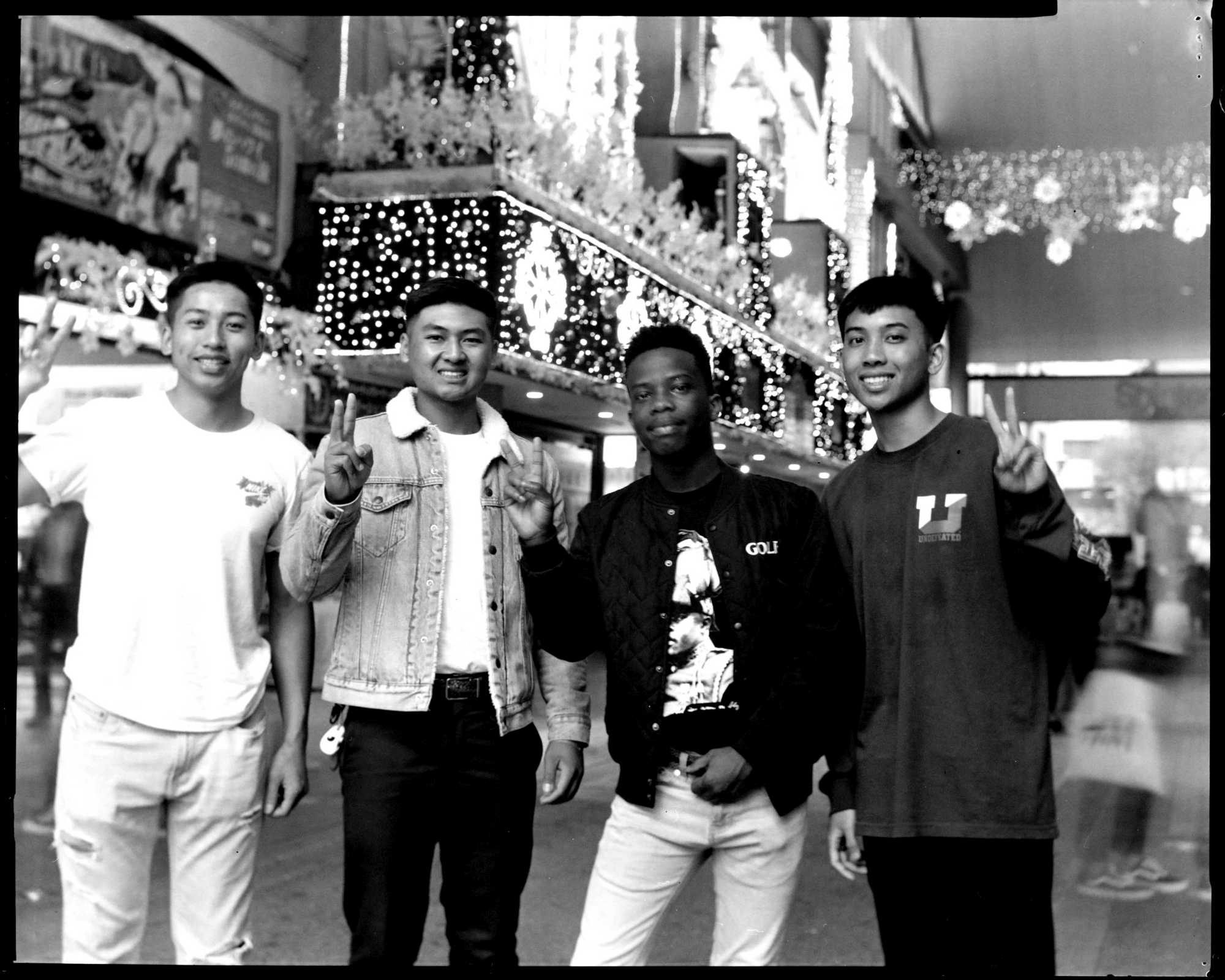前日に引き続き新天町。クリスマス仕様のからくり時計(一時間毎に人工雪が降ります)をバックに撮影。